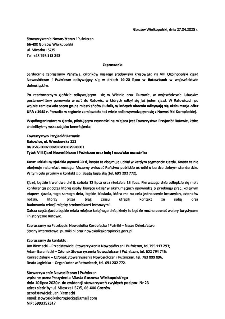 Chętni mogą skorzystać z zaproszenia na Zjazd Nowosiółczan i Puźniczan który odbędzie sią 19 i 20 lipca 2025r (błędna data w zaproszeniu)